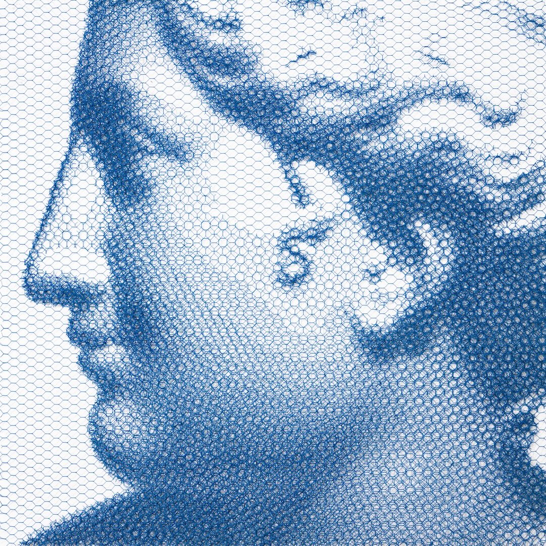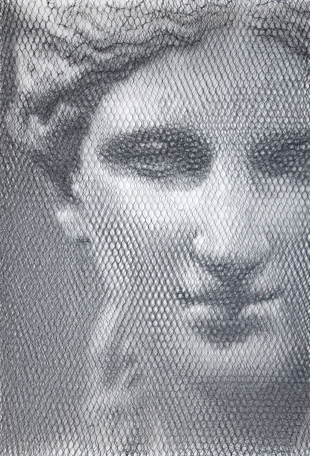 Upstairs, Italian artist Giorgio Tentolini—renowned in the European contemporary art scene for his wire mesh sculptures—presents “The Lights Between.” His work blends light, structure, and classical aesthetics to search for the essence of image between abstraction and figuration. Using finely hand-cut wire layered over monochrome backgrounds, Tentolini creates portraits, statues, and architectural forms purely through the interplay of light and shadow. Viewed closely, the surface dissolves into intricate hexagonal grids; from a distance, ghostly forms subtly emerge.